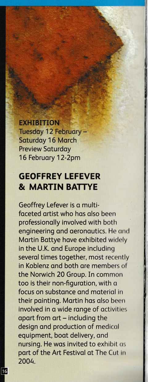 This exhibition at The Cut in February/March 2013 presented work by two members of the Norwich 20 Group.